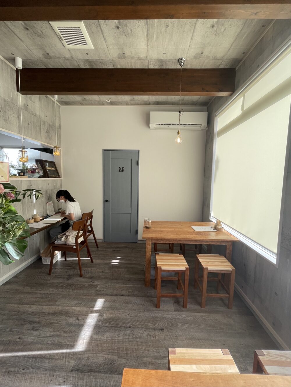 店内はコンクリート打ちっ放し風のクロスと、木の梁と家具でぬくもりも感じられます。カウンターは、ぜひ学生さんの勉強スペースにもどうぞとのことです。こんな素敵で落ちついた空間なら、勉強もはかどっちゃいますね!